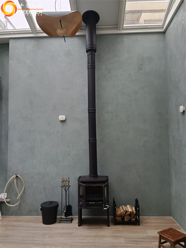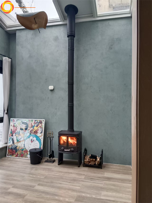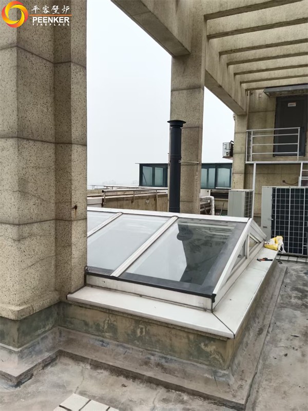 項目情況:該項目位于浙江義烏玫瑰園小區,壁爐安裝在35層頂樓陽光房,煙囪穿頂出戶外加高,固定在旁邊立柱上,由平客項目部上門指導安裝。