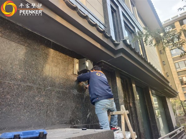項目情況:該項目位于揚州君越首府別墅,壁爐為壁掛式,煙囪穿側墻出,戶外使用壁爐風機解決抽力問題,由平客項目部帶隊上門安裝。