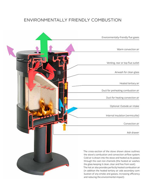 可能您對80%和45%的燃燒效率沒什么概念,舉個簡單的例子,為什么很多人會認為用燃木取暖就是污染環境,因為我們都見過燃木在開放式燃燒下,會產生大量的黑煙的結果。在開放燃燒的情況下,燃燒效率只有20%左右,大量的多余的冷空氣帶走燃木燃燒時產生的熱量,導致燃木不能被完全的燃燒,從而形成顆粒物,也就是我們所說的煙塵!在燃燒效率80%的情況下,燃木完全燃燒,無任何可見顆粒物,燃燒效率越高,供熱效果就越好,也更省燃料,而現在的進口壁爐,一般具備雙重燃燒甚至三重燃燒結構,冷空氣進入壁爐燃燒前,先在爐體中進行加熱,避免冷空氣進入降低燃燒效率,其次,初次燃燒時產生的輕微顆粒物也會在爐膛中再次燃燒,這主要和爐體的設計結構有關!