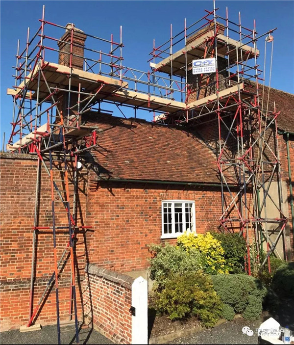 維修這樣的磚石煙囪必須要找專業人員搭建牢固的腳手架,把煙囪頂部完全圍起來,確保工作人員能夠到達煙囪的任何一個側面。這不是一個小工程,像下圖中這樣的腳手架系統,僅僅是搭建和拆除就需要三、四天時間,如果考慮到水泥固化的時間,整個工程可能會耗時一周。